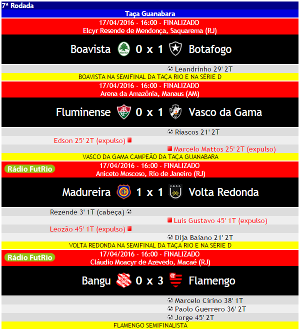 Com a vitória por 1 a 0 sobre o Fluminense, o Vasco chegou a 17 pontos e se sagrou campeão da Taça Guanabara, título que não conquistava desde 2003. As semifinais do Campeonato Estadual, em jogo único, ficaram assim definidas: Vasco x Flamengo e Fluminense x Botafogo. Vasco e Fluminense têm o mando de campo e jogam pelo empate.