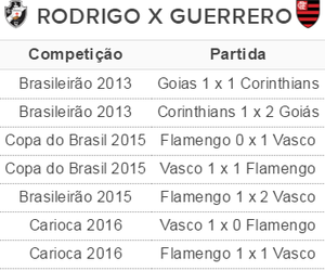 Com o Vasco na Série B, não houve partida com o Timão em 2014 e o reencontro entre Rodrigo e Guerrero já aconteceu rodeado pela rivalidade entre cruz-maltinos e rubro-negros. Nas oitavas de final da Copa do Brasil do ano passado, o peruano participava do clássico pela primeira vez, mas ficou marcado por chance desperdiçada na frente de Martín Silva, em derrota por 1 a 0.