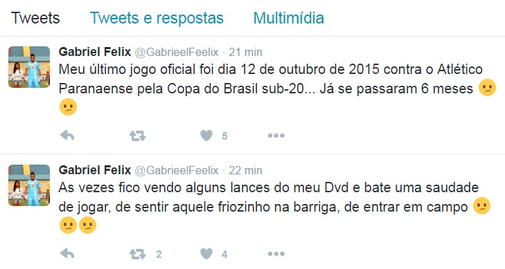 Há 6 meses sem disputar jogo oficial, Gabriel Félix diz no Twitter que sente falta do 'friozinho na barriga'