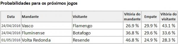 O site Chance de Gol, especializado em estatísticas relacionadas a futebol, calcula em 56,8% a probabilidade do Vasco se classificar para a final do Campeonato Estadual. O índice corresponde à soma das chances de vitória (26,9%) e empate (29,9%) vascaínos diante do Flamengo na semifinal deste domingo (24/04) em Manaus. Já o clube da Gávea, a quem só a vitória interessa, tem probabilidade de 43,1% de ir à decisão. A soma das probabilidades não é 100% devido a questões de arredondamento.
