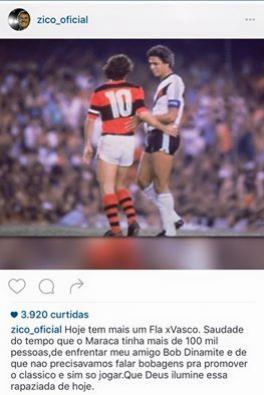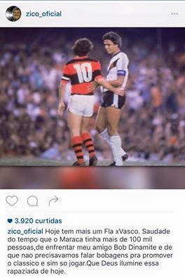 Linda lembrança do meu irmão Zico no seu Instagram oficial. Importante era jogar futebol. Nada era mais fundamental que isso. As novas gerações que aprendam que fincar bandeiras, provocar mal educadamente os adversários, não leva a nada. Obrigado, Zico. Fizemos história também pelo que pensávamos a respeito do esporte, da educação e do nosso torcedor.