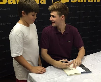 O melhor jogador do futebol carioca ali era secundário. A estrela era outra - e para ela um cercadinho tinha sido preparado. Pais, mães, tias e avós tentavam demarcar um espaço. Uma massa humana se aglomerava e tentava se organizar numa fila. O direito de entrar nessa fila não era para todos. Só podia entrar nela quem tinha a senha distribuída em forma de fitinha amarela. Com ela, e só com ela, seria possível para ter direito à assinatura de Pedro Rezende, ou Rezende Evil, 19 anos, youtuber, gamer, minecrafteiro, autor de dois livros - o segundo dos quais, "De volta ao jogo" era objeto a ser autografado neste evento.