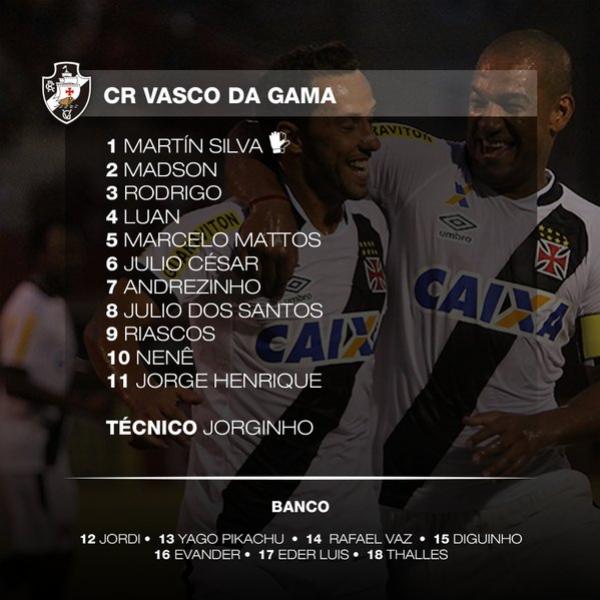 Escalação Vasco: Martin Silva, Madson, Rodrigo, Luan, J. César; Marcelo Mattos, Julio dos Santos, Andrezinho, Nenê; Jorge Henrique e Riascos