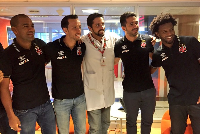 Selfies para lá, elogios para cá e sorrisos. Muitos sorrisos. Os jogadores do Vasco amanheceram a segunda-feira mostrando os dentes. E não podia ser diferente. Campeões do Carioca invictos, Rodrigo, Luan, Andrezinho, Nenê, Rafael Vaz e Madson participaram de divertida gravação do Globo Esporte na companhia luxuosa do troféu do campeonato. Brincadeiras e provocações bem humoradas marcaram a passagem do sexteto pelos estúdios do programa, além da já tradicional frase dita por Rodrigo após eliminar o Flamengo e que marcou a campanha: