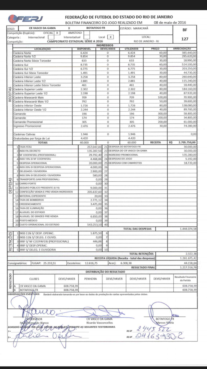 A torcida compareceu, encheu o Maracanã, e o retorno financeiro foi bom para Botafogo e Vasco após o segundo jogo da final do Campeonato Carioca no último domingo. Com o borderô da partida divulgado pela Ferj, o lucro observado foi cerca de 2,5 vezes superior ao do primeiro duelo da decisão. Para o Botafogo, o resultado foi ainda melhor. O clube conseguiu reverter a penhora e embolsar o mesmo valor que o Vasco: R$ 608.758,39.