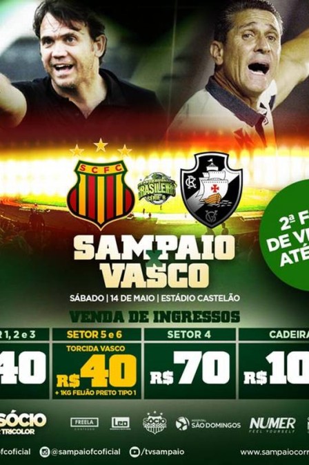 A estreia do Vasco na Série B do Campeonato Brasileiro 2016 será contra o Sampaio Côrrea, no próximo sábado, às 16h (de Brasília), no Estádio Castelão, em Fortaleza. Dois ex-jogadores serão os personagens do confronto. O Gigante da Colina é comandado por Jorginho, campeão Estadual do Rio 2016, enquanto o time maranhense é treinador pelo sérvio Petkovic. Os dois técnicos foram os escolhidos pelo marketing do Sampaio Côrrea para estarem no cartaz com as vendas dos ingressos para o confronto.