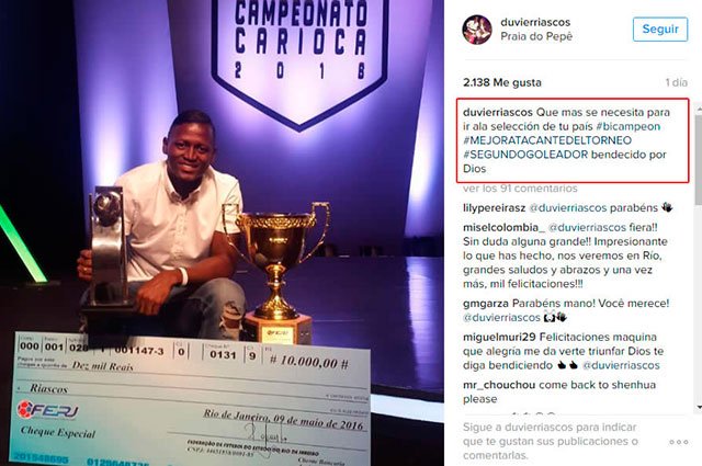 Foi com essas palavras (originalmente em espanhol, acima em tradução livre para o português) que, no Instagram, Riascos reclamou por não estar sendo convocado para a seleção colombiana pelo treinador José Pékerman.