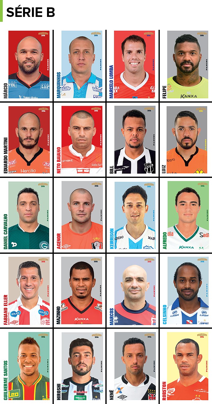 Uns capricham no sorriso, outros preferem um tom mais sério. O álbum do Campeonato Brasileiro 2016 chega às bancas com o início da competição, neste fim de semana. O blog mostra agora uma figurinha de cada um dos 40 clubes das Séries A e B.