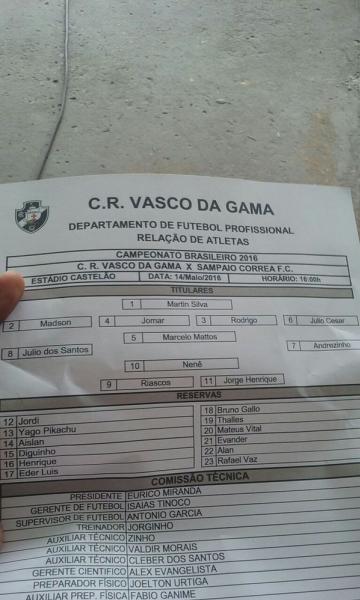 Escalação do Vasco para a estreia na Série B contra o Sampaio Corrêa:
