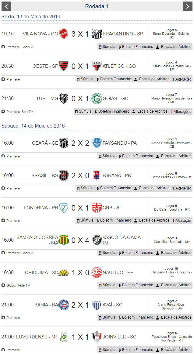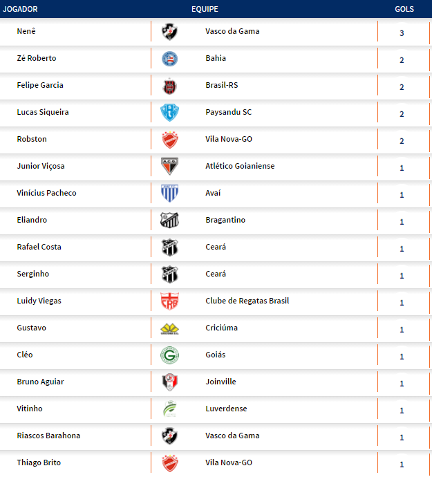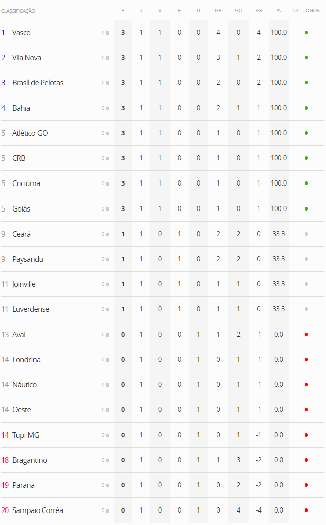 Terminada a 1ª rodada do Campeonato Brasileiro da Série B 2016, o Vasco, que derrotou o Sampaio Corrêa por 4 a 0, lidera a competição pelo critério do saldo de gols. Com 3 gols marcados, Nenê é o artilheiro isolado da competição.