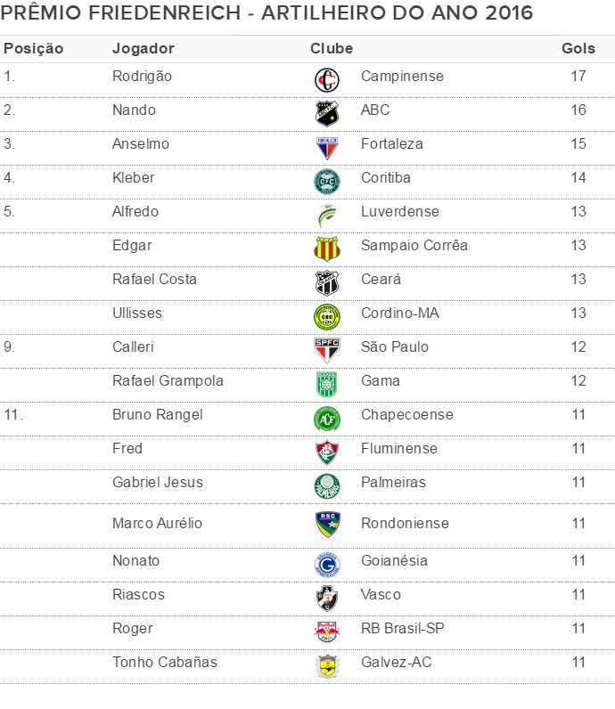 Na 11ª colocação figuram oito concorrentes, Gabriel Jesus, Fred e Riascos estão entre as novidades. O camisa 33 marcou duas vezes na goleada sobre o Atlético-PR por 4 a 0, sábado, pelo Brasileirão. Ainda na Série A, o ídolo do Fluminense anotou o gol na vitória sobre o América-MG por 1 a 0, no Independência. O colombiano, por sua vez, abriu o placar para o Vasco, que aplicou 4 a 0 sobre o Sampaio Corrêa, na estreia da Série B da competição nacional.