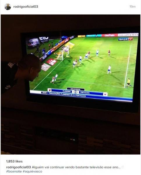 O capitão do Vasco, Rodrigo, não perdoou a eliminação do Flamengo para o Fortaleza, na Copa do Brasil. O zagueiro postou uma foto em seu Instagram em frente a uma televisão, em que aparece o resultado da derrota do Rubro-Negro. Na legenda, o camisa 3 vascaíno escreveu: