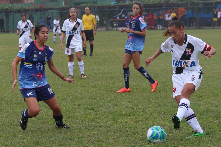 A forte chuva no Estádio Nivaldo Pereira não foi capaz de atrapalhar o bom futebol desenvolvido pela equipe cruzmaltina. Logo aos nove minutos, a volante Angelina tentou o gol olímpico, a bola desviou na zagueira, e bateu no travessão. A boa troca de passes das Meninas da Colina resultou rapidamente no primeiro gol do jogo, aos 15. A zagueira Mariana lançou Rayane em profundidade e a atacante tirou da arqueira com categoria. VASCO 1 a 0. Aos 23, Sthephanie desperdiçou uma chance de aumentar o marcador, após cruzamento pela direita. A meio-campista cabeceou nas mãos da goleira.