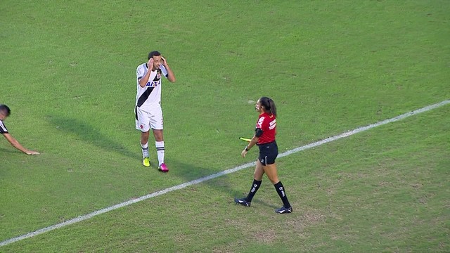 O primeiro lance que irritou Nenê foi a marcação de uma falta por parte da bandeirinha na ponta direita de ataque do Vasco. Voltou a ficar na bronca com impedimento assinalado de forma equivocada e falou ainda mais quando julgou ter sofrido falta. O papo entre os dois foi longo.