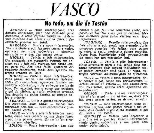 O Vasco, por sua vez teria Edson no lugar de Suingue, Jorginho Carvoeiro na vaga de Ferretti e a esperança de gols a cargo mais ainda de Tostão e Silva.