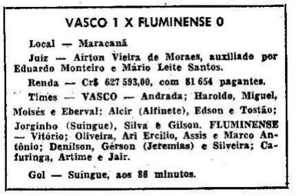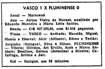 Se Ari Ercílio foi um dos nomes de destaque do tricolor, Gérson e Artime tiveram atuações aquém do esperado, enquanto no Vasco Edson foi importante no bloqueio, mas seu substituto, Suingue, fundamental na vitória, autor do gol único do jogo.