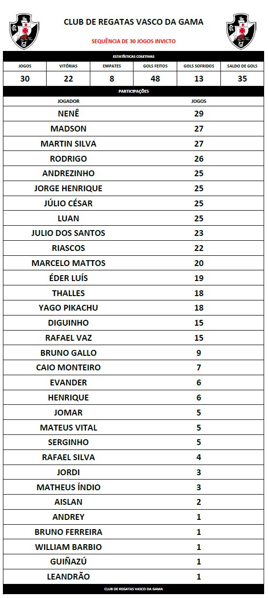 Após a vitória sobre o Vila Nova por 2 a 0, o Vasco chegou a marca de 30 jogos oficiais de invencibilidade em sua história.
