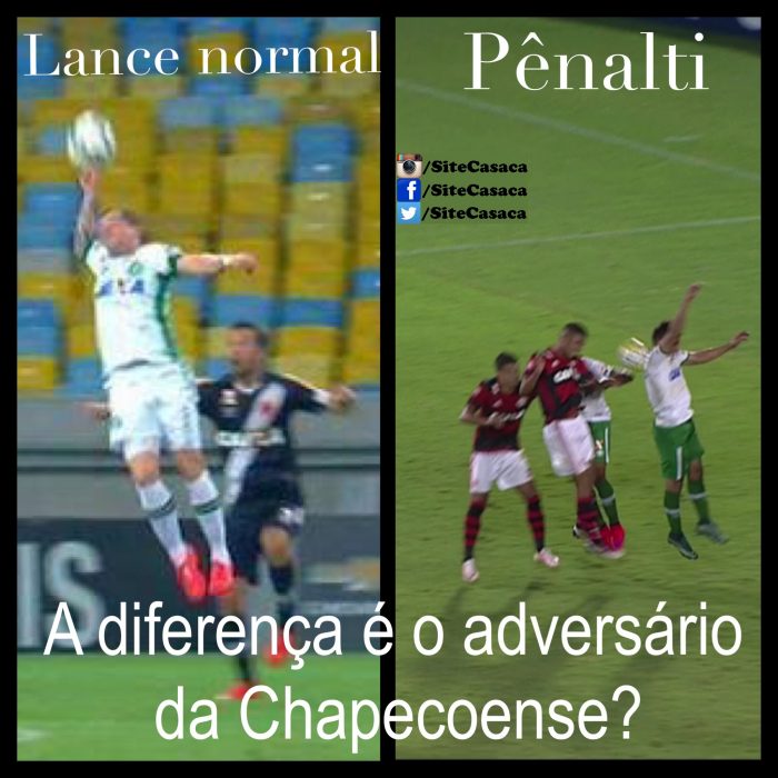 Na última quarta-feira em Volta Redonda a Chapecoense teve um pênalti no primeiro tempo mal marcado quando perdia por 1 x 0 para o Flamengo. Empatou e ainda na primeira etapa teve outro a seu favor, desta vez ignorado pela arbitragem, que errou novamente. Na segunda etapa o atleta Éverton do Flamengo foi bem expulso após aplicar algo parecido com um coice no adversário, mas na última bola do jogo, quando o placar era de 2 x 1 a favor da Chapecoense, a arbitragem achou um pênalti para o Flamengo (imagem desta matéria), que foi transformado em gol após a cobrança de Alan Patrick.