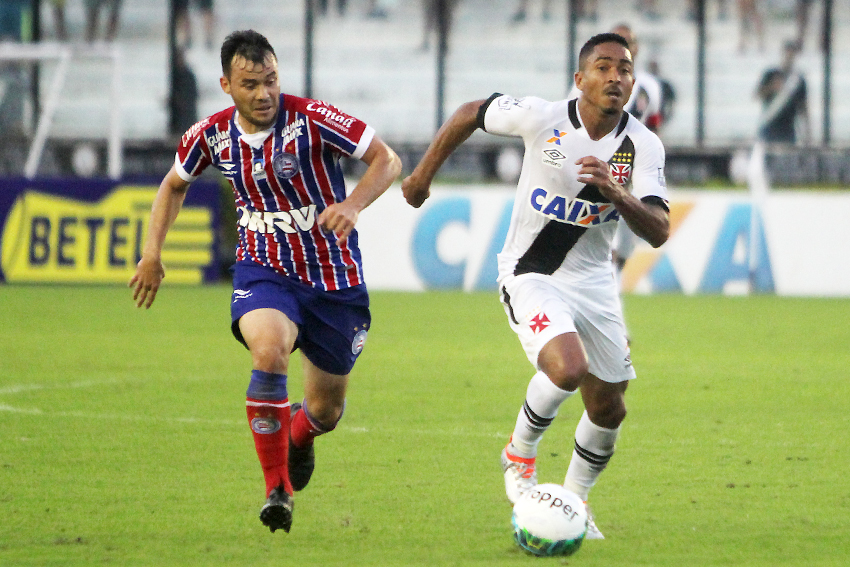 Bahia e Vasco fizeram um primeiro tempo movimentado em São Januário. O time carioca manteve sua postura de muita marcação e saídas rápidas para o ataque. Foram os baianos que tiveram o primeiro tiro em gol, mas sem perigo. João Paulo mandou a bola para o ataque, Renato Cajá recebeu e deu de calcanhar para Hernane, que tentou o chute de longe mas Jordi segurou sem problemas.