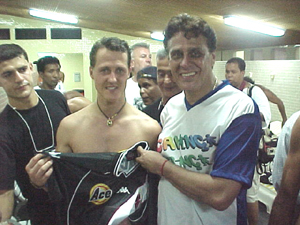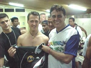 Roberto Dinamite entrega a camisa do Vasco ao piloto de fórmula um, o alemão Michael Schumacher em 2000, em jogo festivo que teve no Maracanã para o Criança Esperança com jogadores, ex jogadores, artistas e vários esportistas.