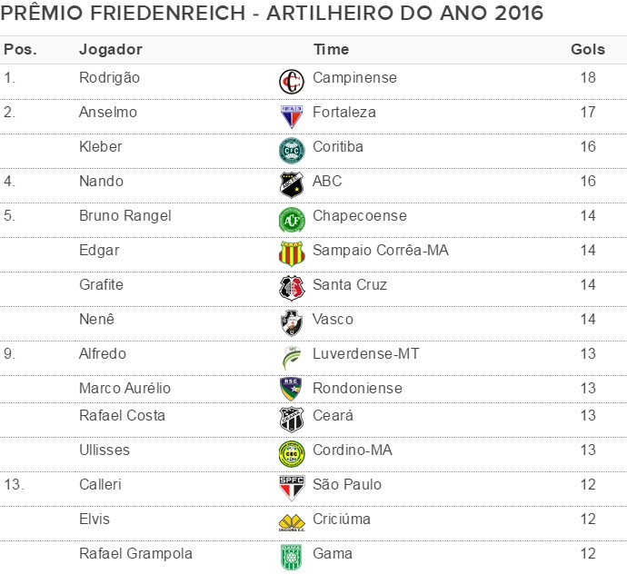 Quem também figura pela primeira vez no ranking é Elvis, do Criciúma. Ele marcou na derrota para o CRB por 2 a 1 na rodada de final de semana da Série B e chegou aos 12 gols. O meia aparece no final da lista, juntamente com Calleri,do São Paulo, e Rafael Grampola, do Gama.
