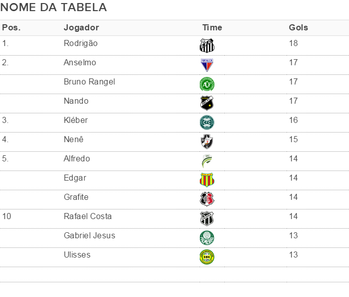 O atacante Nando, do ABC, e o meia Nenê, do Vasco, marcaram um gol cada nesta última semana e estão com 17 e 15 bolas nas redes, respectivamente.