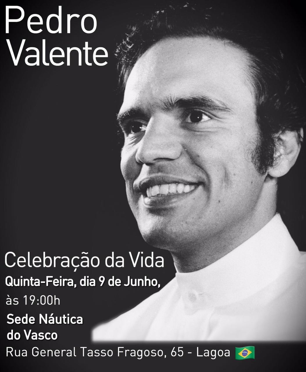 O Club de Regatas do Vasco da Gama comunica aos seus associados e torcedores que será realizado na próxima quinta-feira (09/06), às 19 horas, na Sede Náutica da Lagoa, um encontro de Celebração da Vida em homenagem ao Dr. Pedro Valente. Com mais de 40 anos dedicados ao Vasco, o Grande Benemérito faleceu no último mês. A cerimônia será aberta aos amigos, admiradores e torcedores vascaínos.