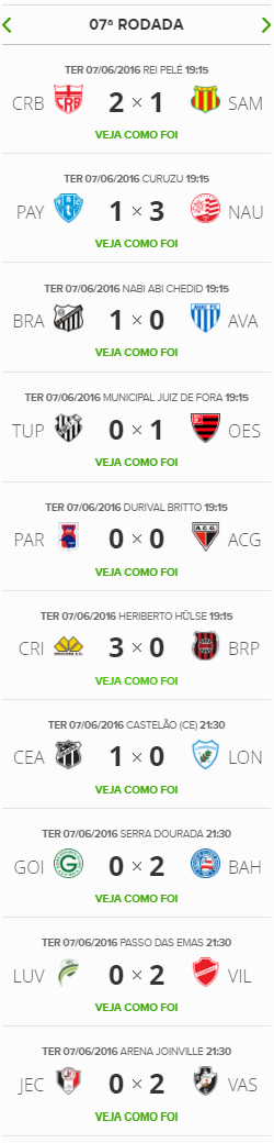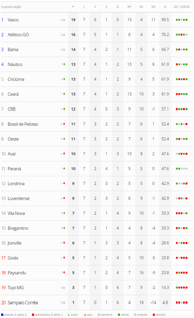 Terminada a 7ª rodada do Campeonato Brasileiro da Série B 2016, o Vasco, que derrotou o Joinville por 2 a 0, segue na liderança isolada e invicta da competição, agora 3 pontos à frente do vice-líder Atlético-GO. O Gigante da Colina está a 6 pontos do 5º colocado, o Criciúma.