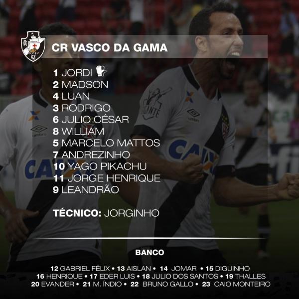Vasco escalado! Jordi, Madson, Luan, Rodrigo e Julio Cesar; Mattos, William, Andrezinho e Pikachu; Jorge Henrique e Leandrão. #gevas