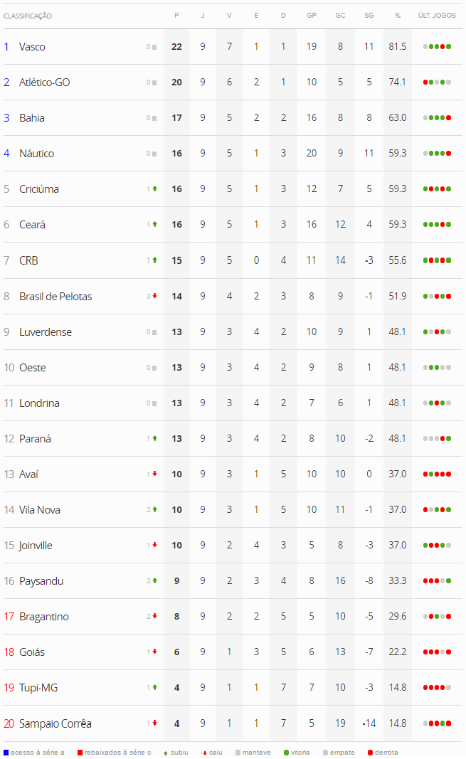 Terminada a 9ª rodada do Campeonato Brasileiro da Série B 2016, o Vasco, que derrotou o Náutico por 3 a 2, segue na liderança da competição, agora novamente de forma isolada, 2 pontos à frente do vice-líder Atlético-GO. A diferença para o 5º colocado (agora o Criciúma), que era de 5 pontos, voltou a ser de 6 pontos.