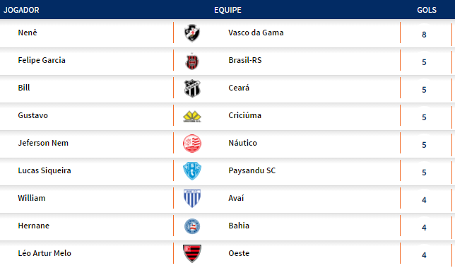 Com 8 gols marcados, Nenê é o artilheiro isolado do campeonato, 3 gols à frente de seus perseguidores mais próximos.