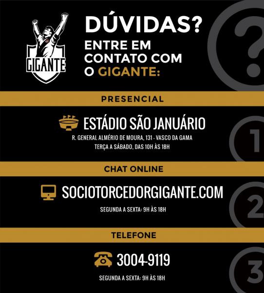 Além do atendimento telefônico, os vascaínos podem entrar em contato com o Gigante através do chat online, no site www.sociotorcedorgigante.com, nos mesmos horários. A Central de Atendimento presencial funciona de terça-feira a sábado, entre 10h às 18h, no Estádio de São Januário, ao lado do portão principal.