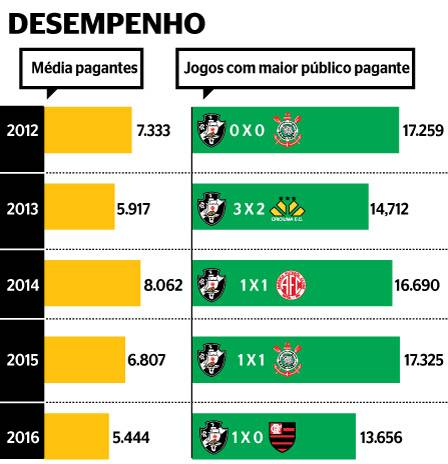 Até a partida contra o Náutico, foram 15 jogos na Colina, incluindo três clássicos, um contra o Flamengo e dois diante do Botafogo. Ainda assim, a média de 5.444 pagantes é baixa, principalmente se for levado em consideração o esforço da diretoria ano passado para ampliar a capacidade de São Januário para 21.880 torcedores.