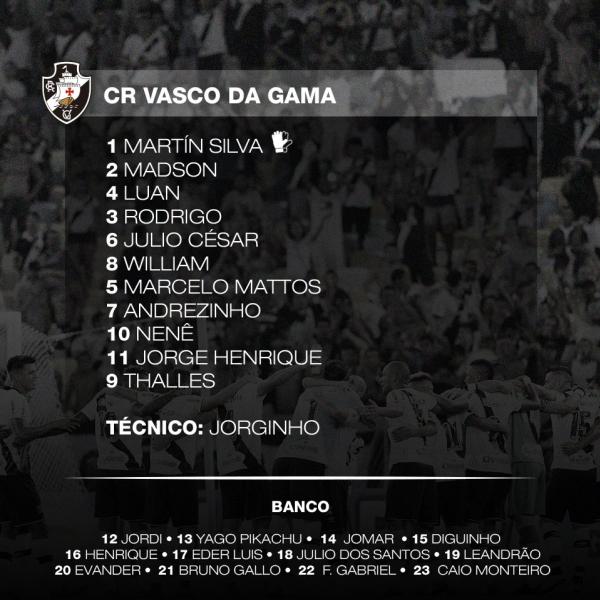 Escalação Vasco: Martin Silva, Madson, Rodrigo, Luan, Júlio César; Marcelo Mattos, William, Andrezinho, Nenê; Jorge Henrique e Thalles.