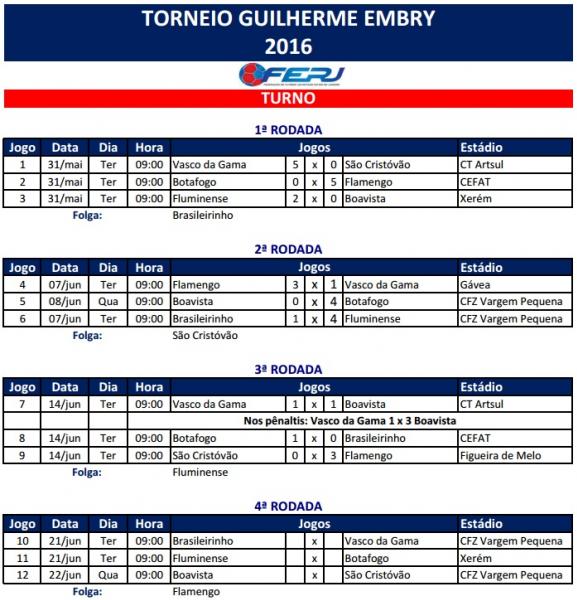 Após estrear no Torneio Guilherme Embry Sub-16 com uma goleada de 5 a 0 sobre o São Cristóvão, o Vasco perdeu para o Flamengo por 3 a 1 na 2ª rodada e, na 3ª, foi derrotado pelo Boavista nos pênaltis após empatar no tempo normal. O Gigante da Colina ocupa a 4ª colocação na tabela do 1º turno.