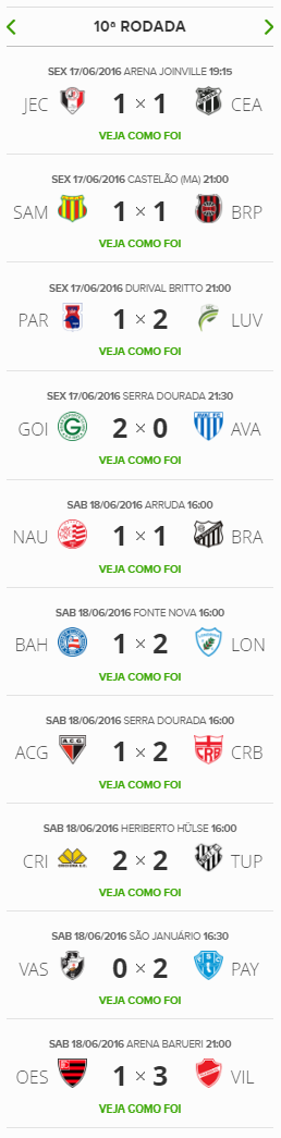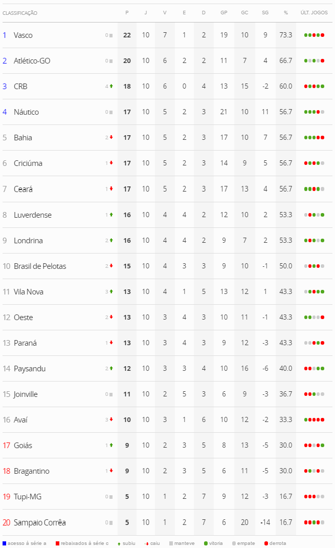 Terminada a 10ª rodada do Campeonato Brasileiro da Série B 2016, o Vasco, que perdeu para o Paysandu por 2 a 0, segue na liderança isolada da competição 2 pontos à frente do vice-líder Atlético-GO. A diferença para o 5º colocado (agora o Bahia), que era de 6 pontos, voltou a ser de 5 pontos.