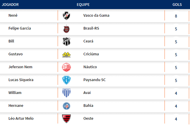 Com 8 gols marcados, Nenê é o artilheiro isolado do campeonato, 3 gols à frente de seus perseguidores mais próximos.