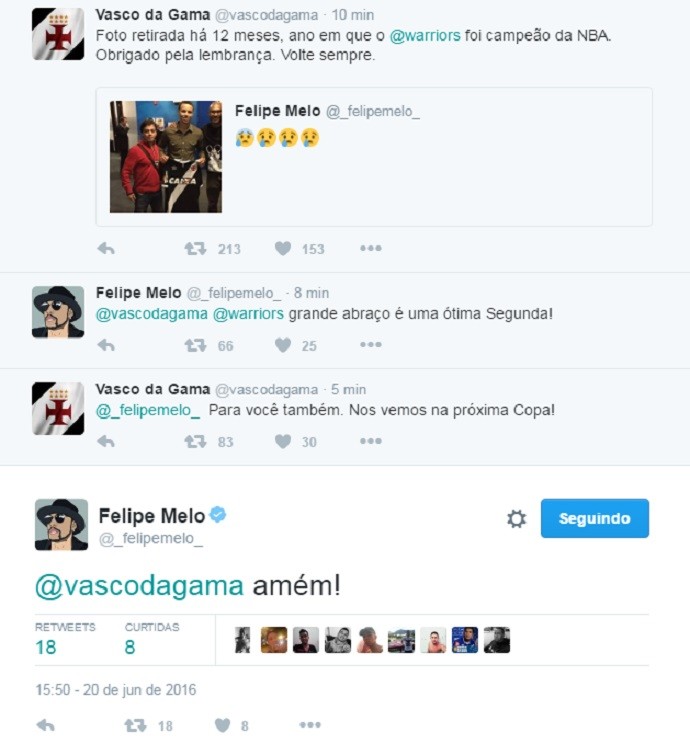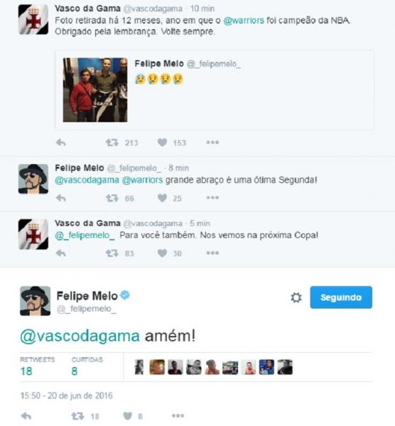 Formado nas divisões de base do Flamengo e rubro-negro fanático, o volante Felipe Melo, do Internazionale, provocou o Vasco nesta segunda-feira, via Twitter. Postou uma imagem de Stephen Curry, astro do Golden State Warrios, vice-campeão da NBA, segurando a camisa cruz-maltina. Na mesma rede social, o clube rebateu, dizendo que a foto foi tirada no ano passado, logo após o Warriors conquistar o título. Na tréplica, Felipe voltou a provocar e desejou uma "ótima segunda".