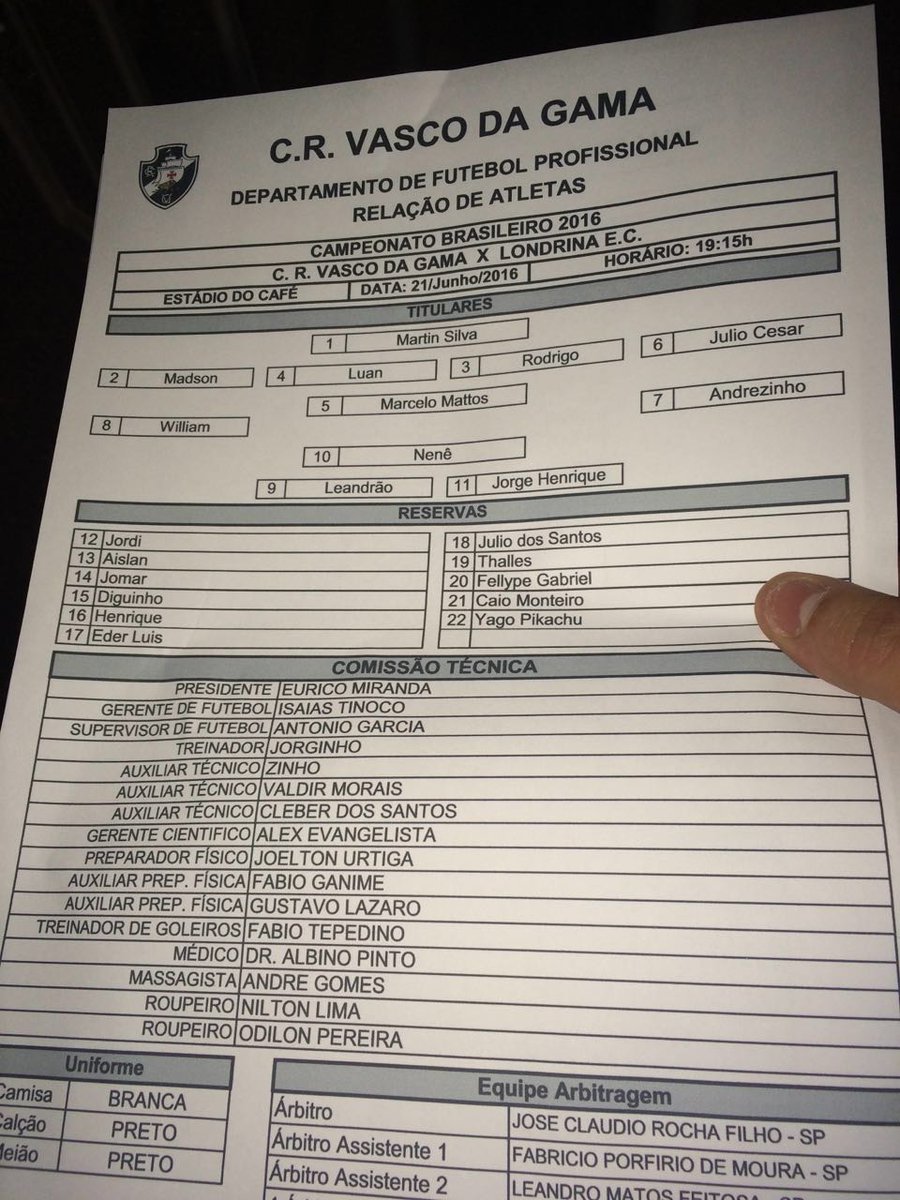 Confira escalação do Vasco; Nenê volta e William e Leandrão seguem titulares