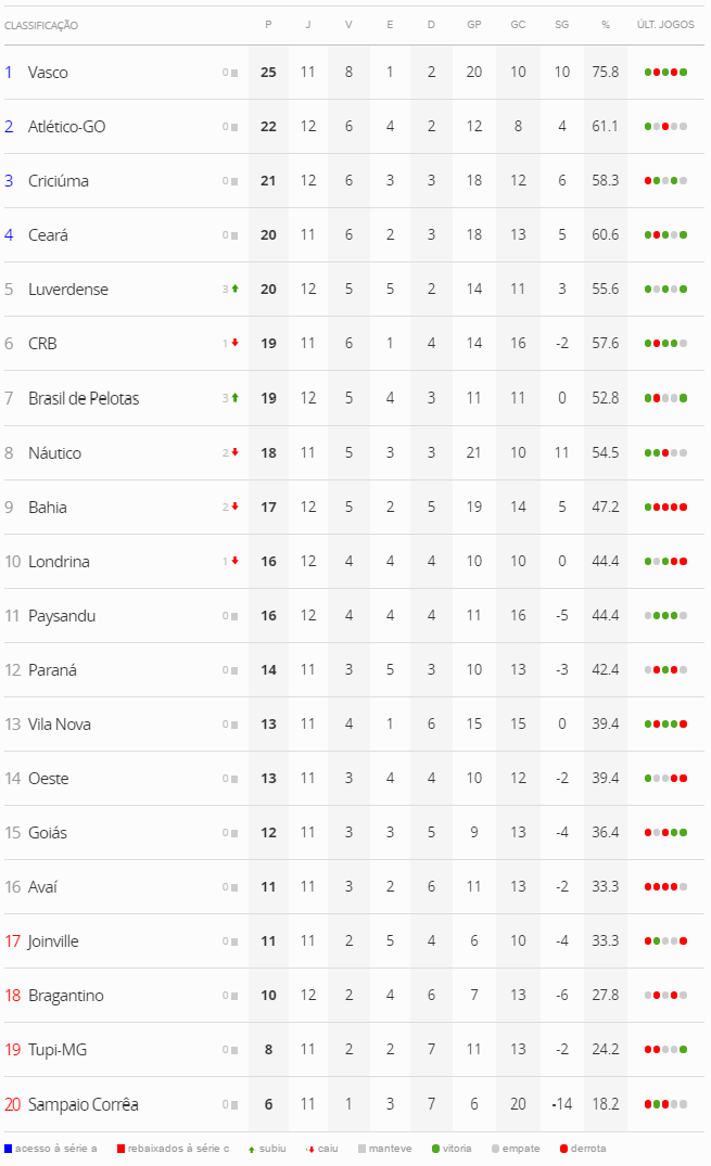 Atlético-GO e Criciúma, respectivamente 2º e 3º colocados do Brasileiro da Série B, empataram seus jogos nesta 6ª-feira (24/06). Desta forma, se o Vasco derrotar o CRB neste sábado (25/06), abrirá no mínimo 5 pontos para o vice-líder e 8 pontos para o 5º colocado independentemente do resultado de Ceará x Náutico.