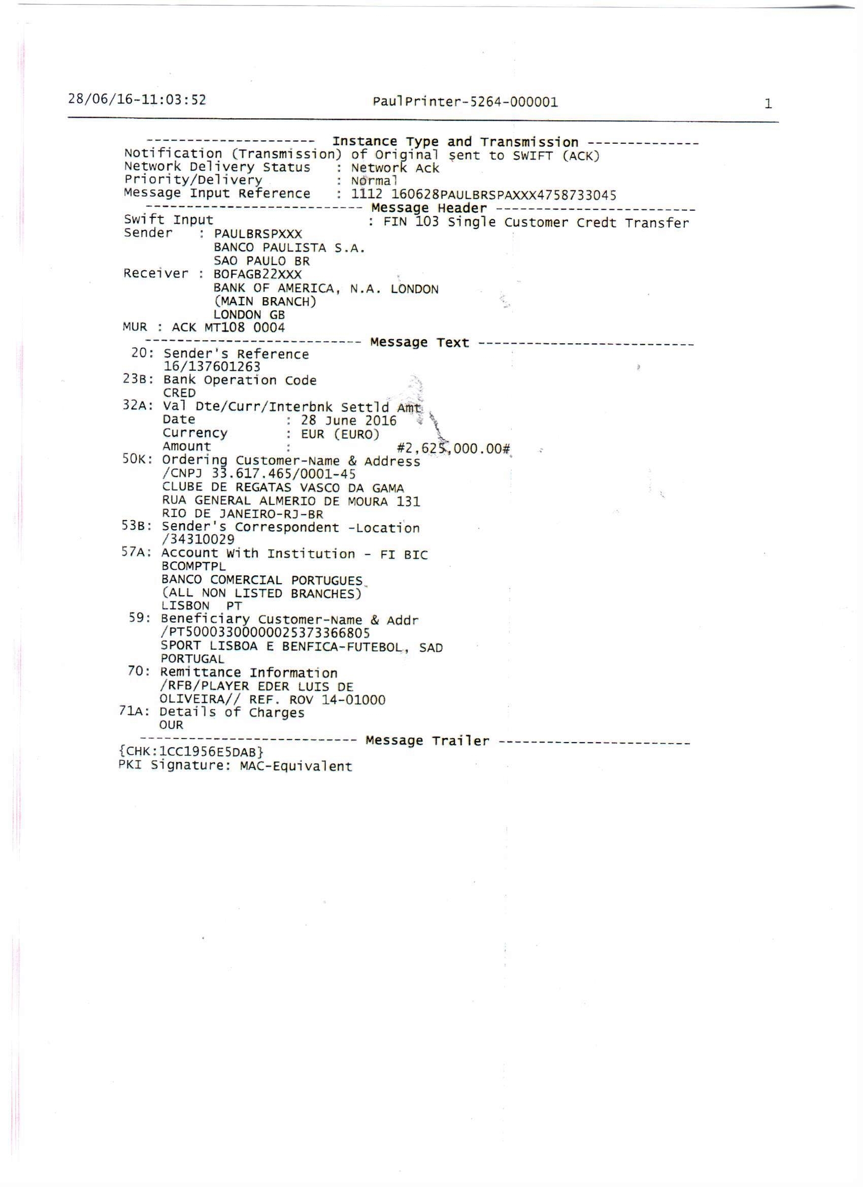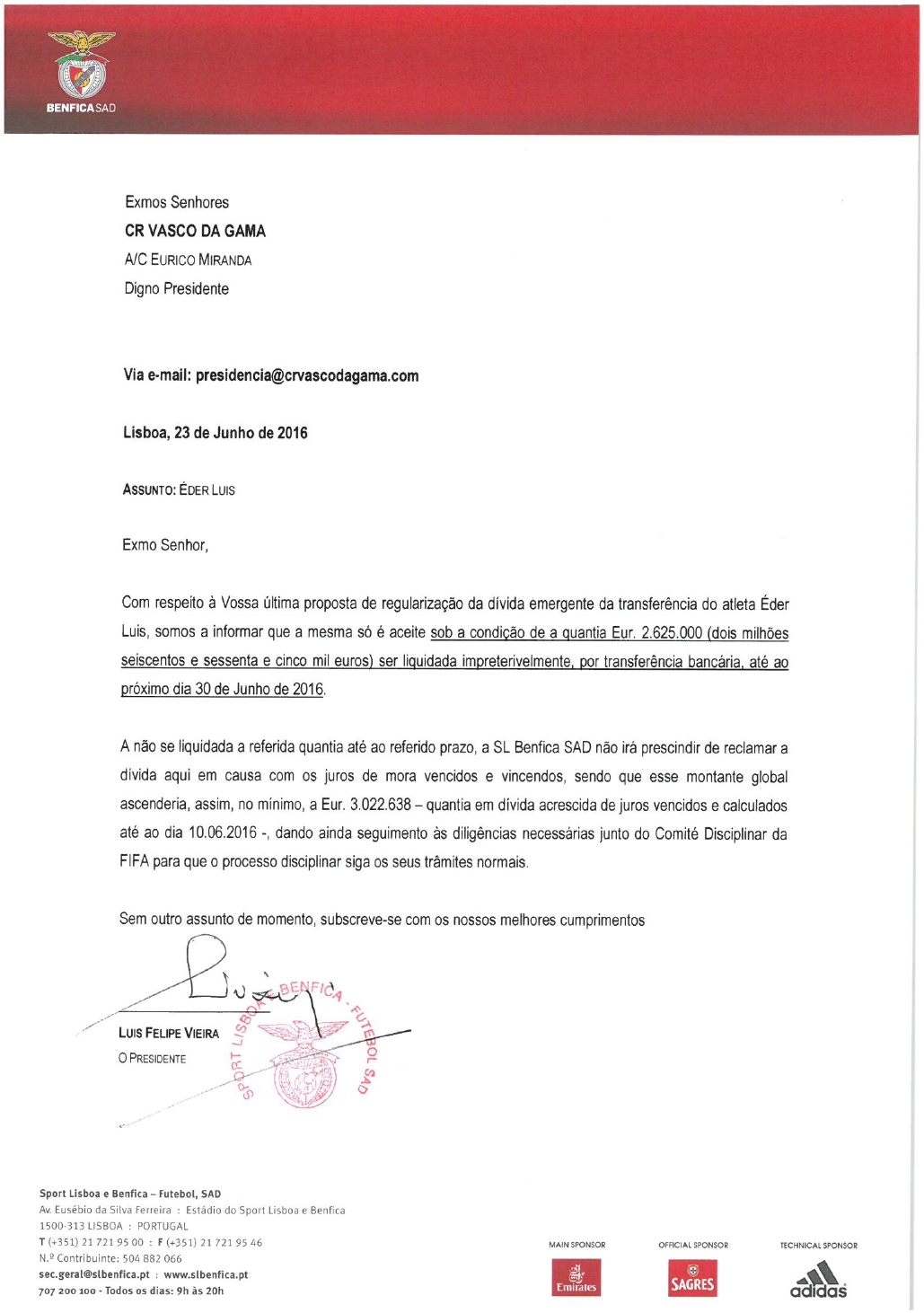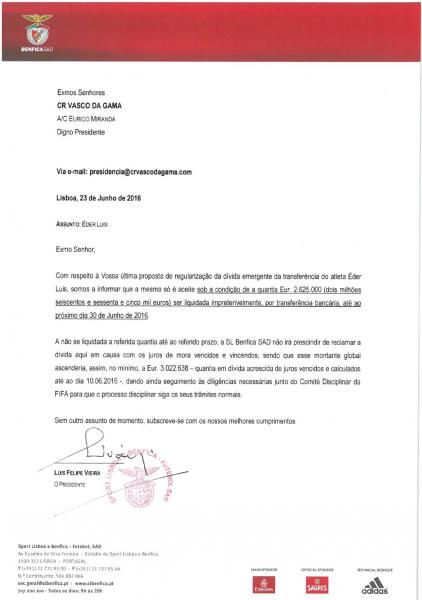 Publico abaixo a carta enviada pelo Presidente do SL Benfica exigindo o pagamento imediato e o comprovante do envio pelo Vasco de 2,6 milhões de euros. Além disso, houve a incidência dos impostos sobre a remessa, o que elevou o gasto aos 12 milhões de reais já referidos.