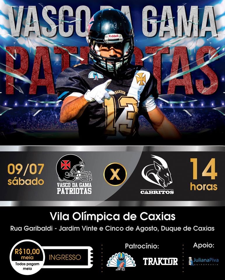 O Vasco Patriotas estreia no Campeonato Brasileiro de Futebol Americano, no dia 09/07 às 14h . Na Vila Olímpica de Caxias.