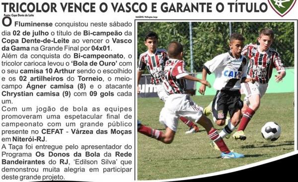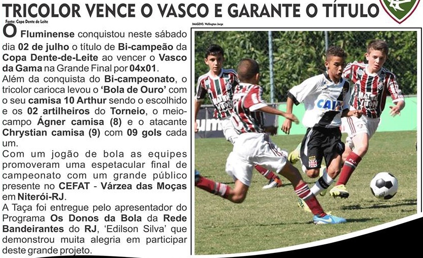 O Vasco perdeu para o Fluminense por 4 a 1 na manhã deste sábado (02/07), pela final da Copa Dente-de-Leite Sub-11. Disputada no Cefat, a partida foi apitada por Marcelo de Lima Henrique. O gol vascaíno foi marcado por Victor Diotti. Pelo lado tricolor, o destaque foi Crysthyan, que marcou 3 gols.