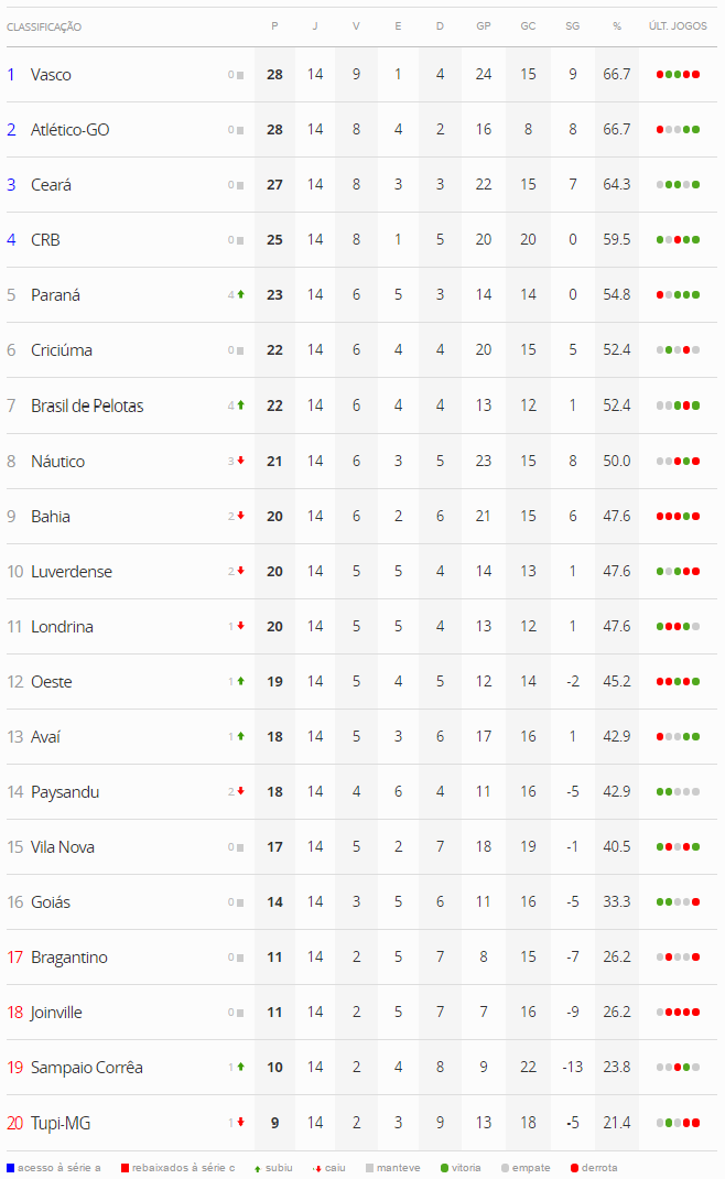 Terminada a 14ª rodada do Campeonato Brasileiro da Série B 2016, o Vasco, que perdeu para o Avaí por 2 a 1, segue na liderança da competição, porém agora não mais de forma isolada e sim devido ao critério do número de vitórias (9 contra 8 do vice-líder Atlético-GO). A diferença para o 5º colocado (agora o Paraná), que era de 7 pontos, caiu para 5 pontos.