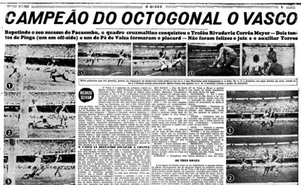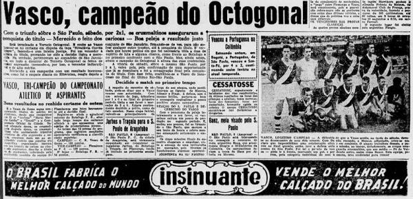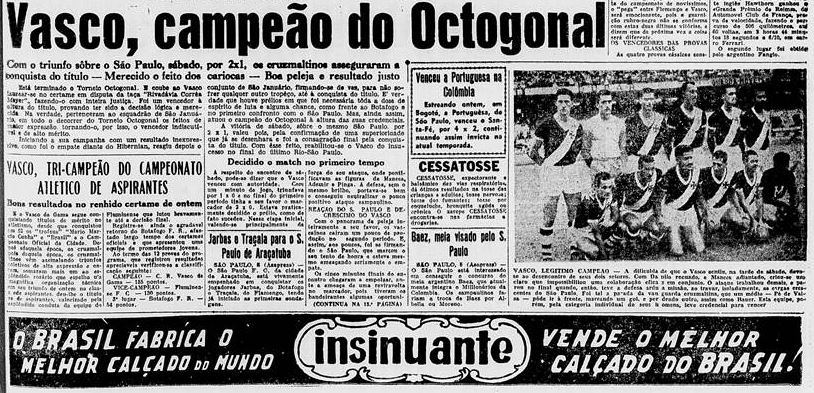 “Está terminado o Torneio Octogonal. E coube ao Vasco laurear-se no certame em disputa da taça “Rivadavia Corrêa Meyer”, fazendo-o com inteira justiça. Foi um vencedor à altura do titulo, provando ter sido a decisão lógica e merecida. Na verdade, pertenceram ao esquadrão de São Januário, em todo o decorrer do Torneio Octogonal os feitos de maior expressão tornando-o, por isso, o vencedor indiscutível de alto mérito.