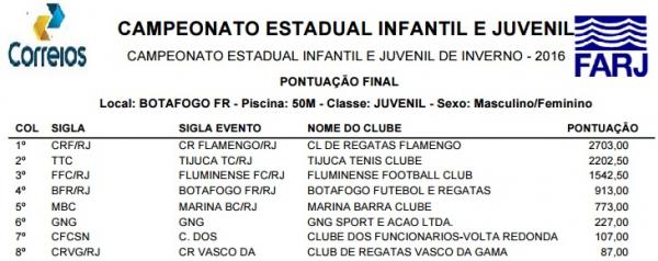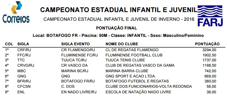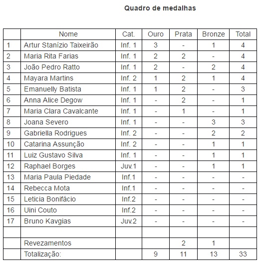 A equipe Cruzmaltina, liderada pelo nadador Artur Stanízio Taixeirão, atleta Cruzmaltino que mais medalhas de ouro conquistou (3 de 4 possíveis, com mais 1 bronze) marcou 749 pontos, colocando-a no terceiro lugar da categoria Infantil 1, contra 927 pontos do Fluminense, 2º colocado e 1091 do Flamengo, campeão da categoria.