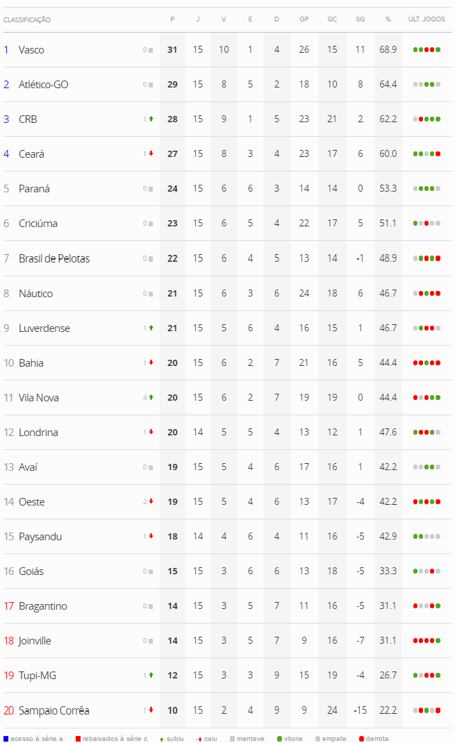 Com a vitória sobre o Brasil de Pelotas, o Vasco se garante por mais uma rodada como líder do Brasileiro da Série B, abrindo 2 pontos para o vice-líder Atlético-GO. O jogo das 21h, Paysandu x Londrina, não influencia a situação vascaína.