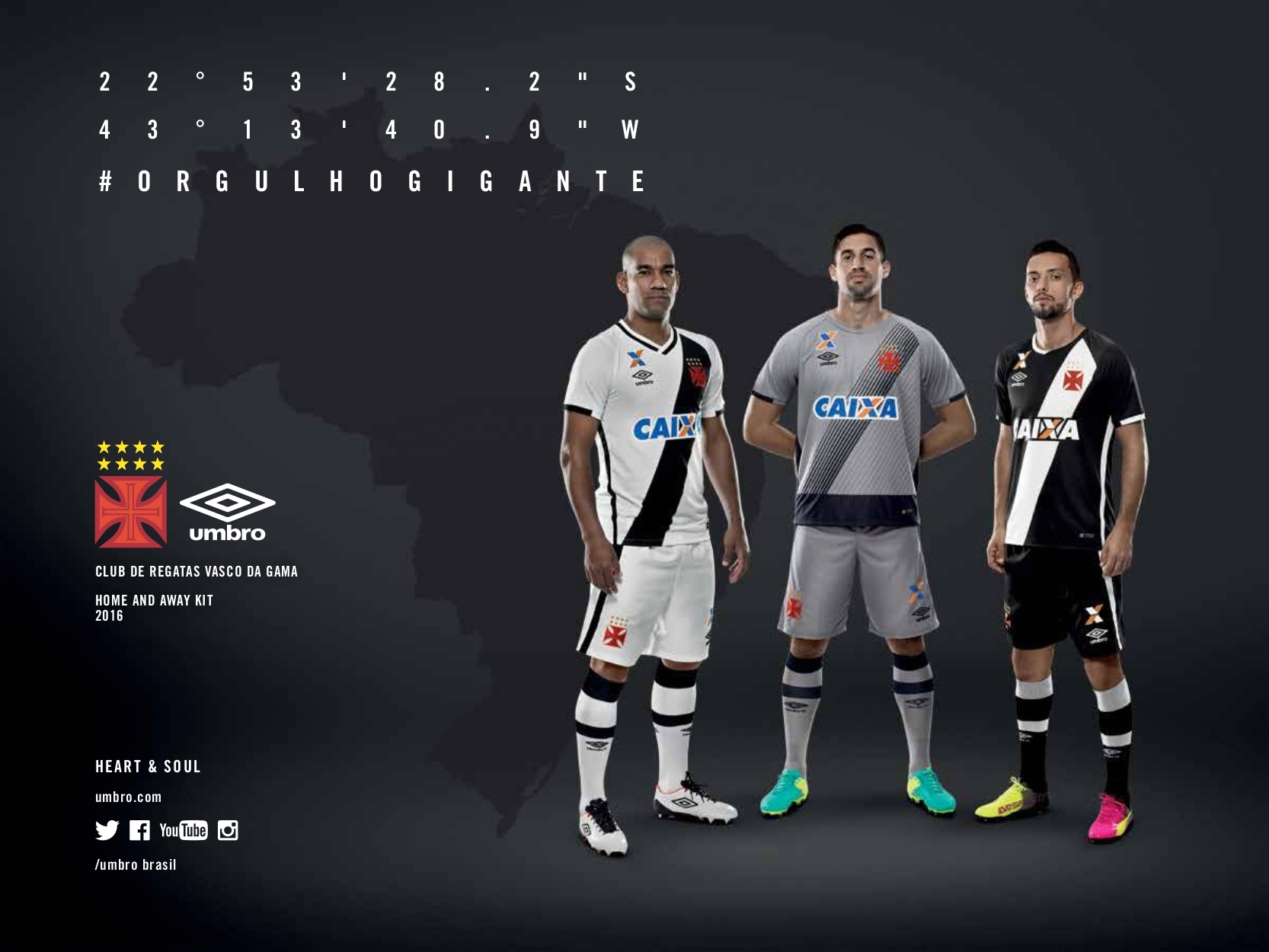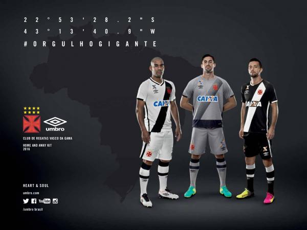 O Club de Regatas Vasco da Gama ganha novas camisas, desenhadas especialmente para o time carioca pela fornecedora esportiva Umbro. A equipe da marca inglesa trabalhou em conjunto com a diretoria do clube para concepção do uniforme. Sem fugir da tradicional essência do Vasco, as camisas agregam visual inovador com inspirações nos padrões contemporâneos, além de fazer alusão ao maior evento esportivo do país, hospedado pela cidade do Rio de Janeiro.