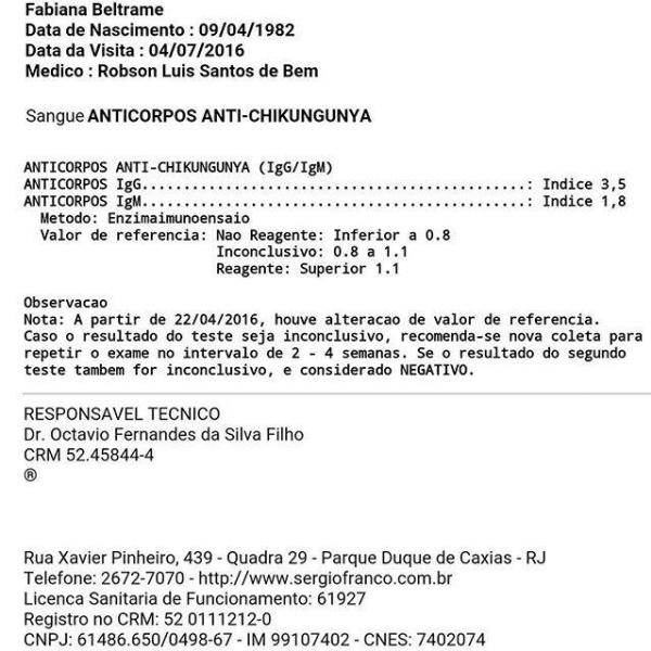 Voltei pra casa, mas as dores estavam mais frequentes e minhas articulações estavam inchando. Não aguentava mais. Já estava achando realmente que era coisa da minha cabeça e decidi investigar. Muitas pessoas que pegaram zika, dizem que é assim mesmo, os sintomas voltam de vez em quando. Mas como os sintomas estavam muito fortes, o Dr. Robson desconfiou que era Chikungunya e me pediu um exame de sangue. O resultado deu positivo.