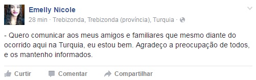 "Quero comunicar aos meus amigos e familiares que mesmo diante do ocorrido aqui na Turquia, eu estou bem. Agradeço a preocupação de todos, e os mantenho informados", escreveu Emelly.